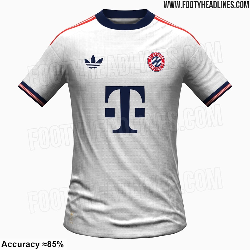 拜仁26/27客场球衣谍照:白色为主搭配三叶草logo,经典队徽回归
